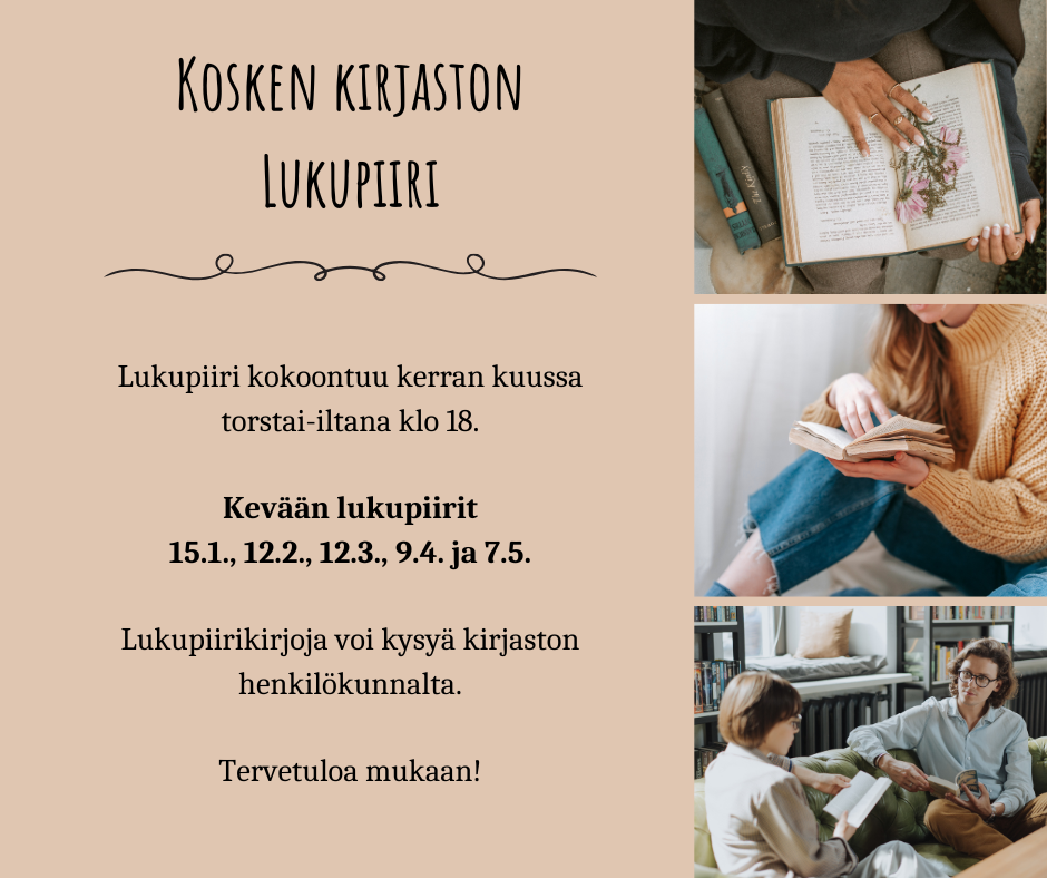 Kosken Tl kirjasto Hämeentie 12, Koski TlLukupiiri kokoontuu kirjastolla kerran kuussa torstai-iltana klo 18. Kevään lukupiirit: [...]