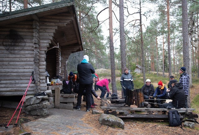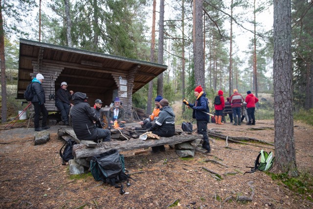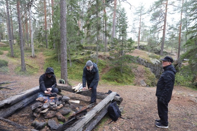 Meillä oli tiedossa, että tulentekopaikalla Lotikon kellarilla ei ole polttopuita. Niinpä osasimme asiaan varautua ja muutamat meistä olivatkin pakanneet reppuunsa klapeja ettei tarvinnut makkaroita kylmänä syödä. Lotikolta oli vielä lähtöpaikkaan vajaa 5km. Sää oli mitä mukavin eikä navakka tuulikaan metsän suojassa tuntunut.