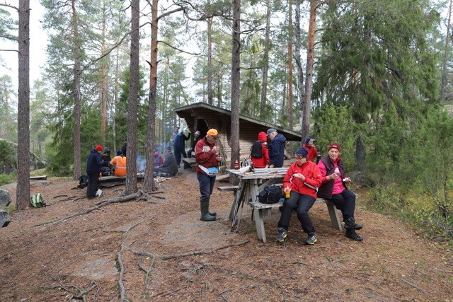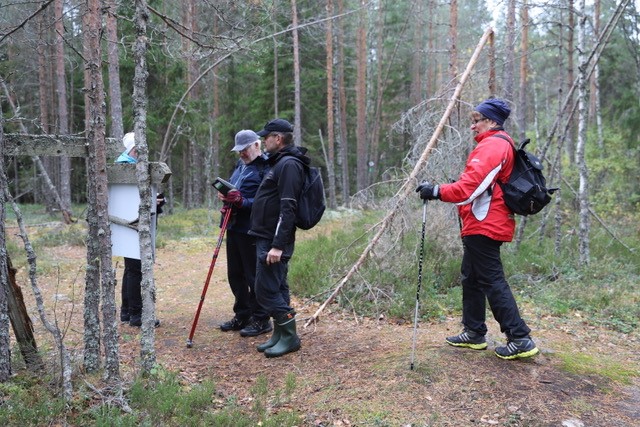 Tämän syksyn retki tehtiin vierailemalla ihan toisen kunnan puolelle, eli mentiin Marttilan korven eräreitistöä pitkin Lotikon kellaria ihastelemaan.  Matka alkoi Nuortentuvan pihasta klo 10, josta pääosa kahdeksastatoista osallistujasta meni Palaisten uimarannan pysäköintipaikalle autokyydeillä. Toiselle osalle oli suunniteltu lyhyempi kävelymatka Lotikolle, eli he menivät metsäautotietä kävelyreitin varteen josta on vain noin 2,5 km kävelymatka kohteeseen.